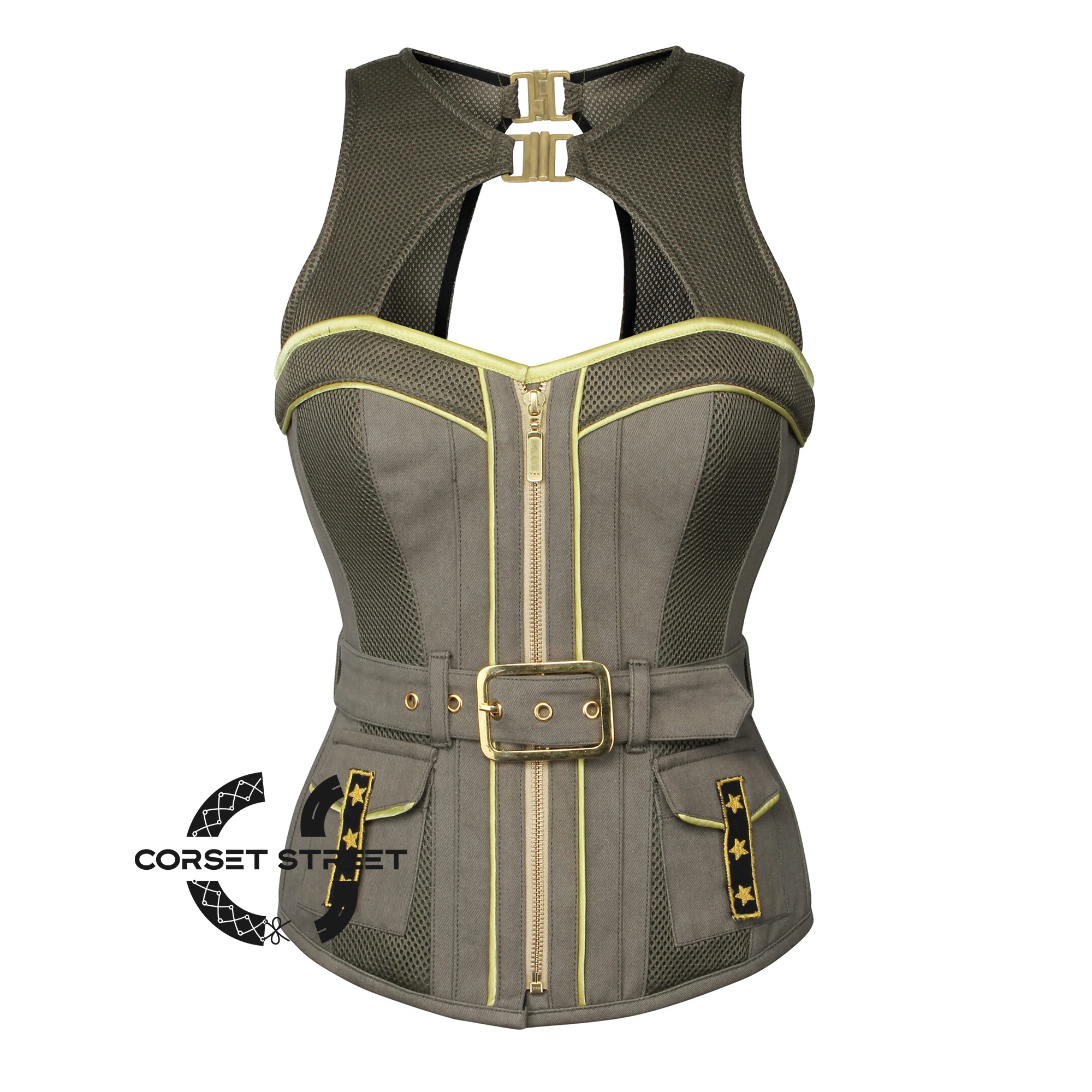 Army Green Cotton With Mesh Military Costume Steampunk Overbust Plus Size Corset Top