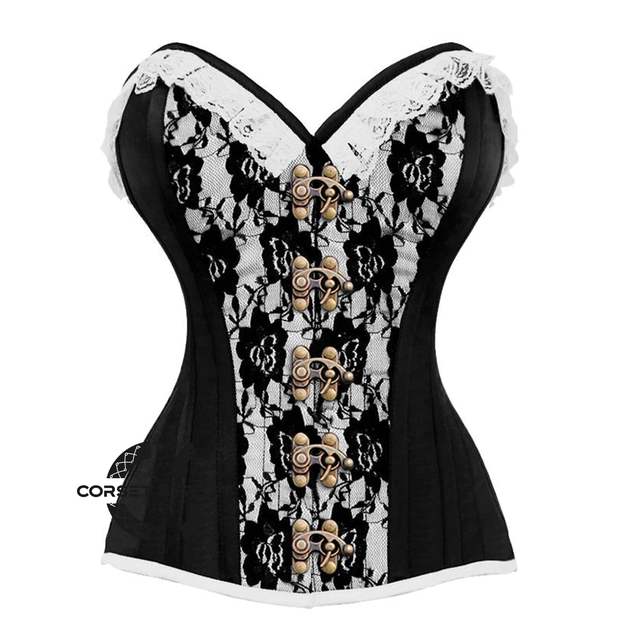 The antique clasps on the front of the corset can be easily opened and closed for putting on or taking off the garment.The black and white brocade fabric gives the corset an elegant and sophisticated look, while the antique clasps add a touch of vintage charm.