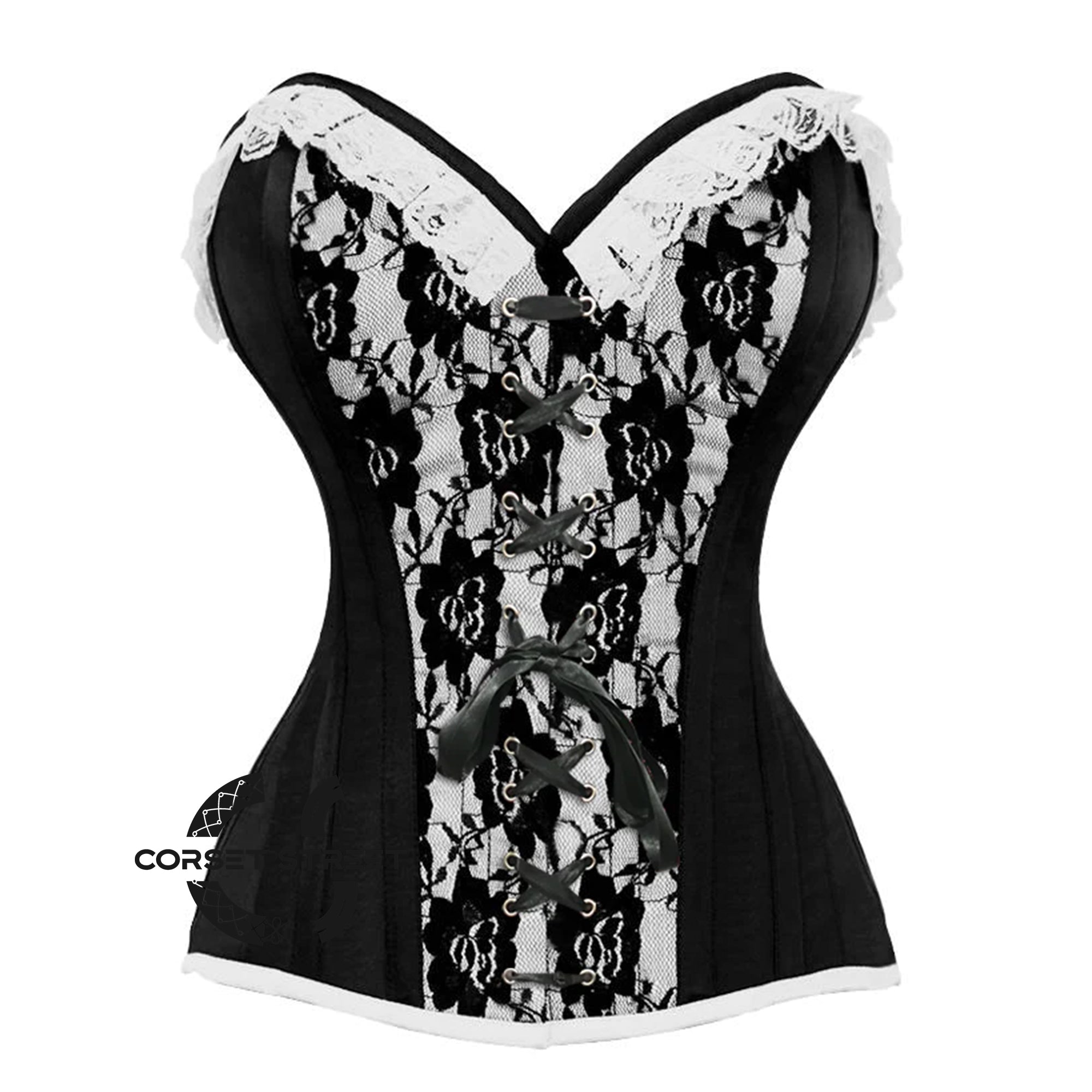 The ribbons on the front of the corset can be tied in a bow or left hanging, depending on personal preference. This type of corset may also feature additional details such as boning, lace-up back, or adjustable straps for a comfortable and secure fit. The black and white brocade with front ribbon overbust corset can be worn for a variety of occasions, including formal events, cosplay, or as part of a romantic or vintage-inspired outfit.