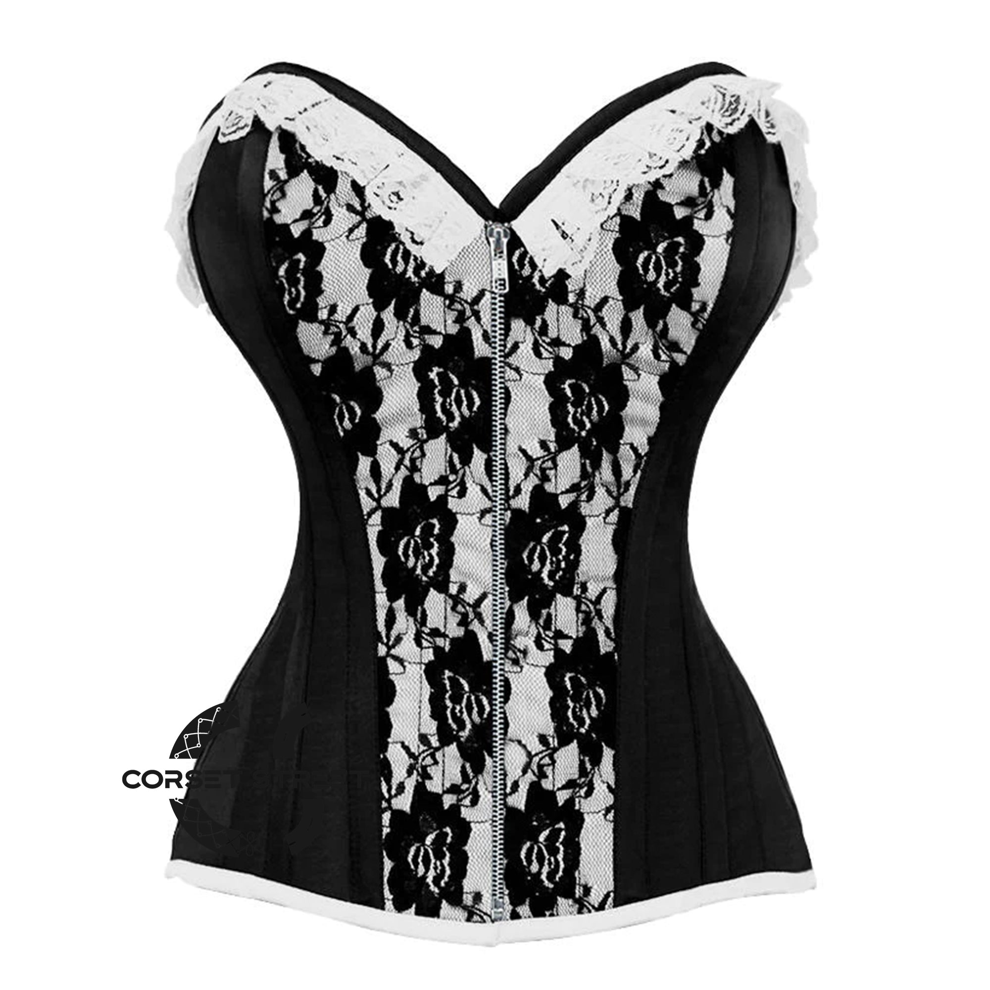 A black and white brocade with a front silver zipper overbust corset is a versatile and stylish piece of clothing that can be worn for a variety of occasions, such as formal events, cosplay, or as part of a burlesque outfit.