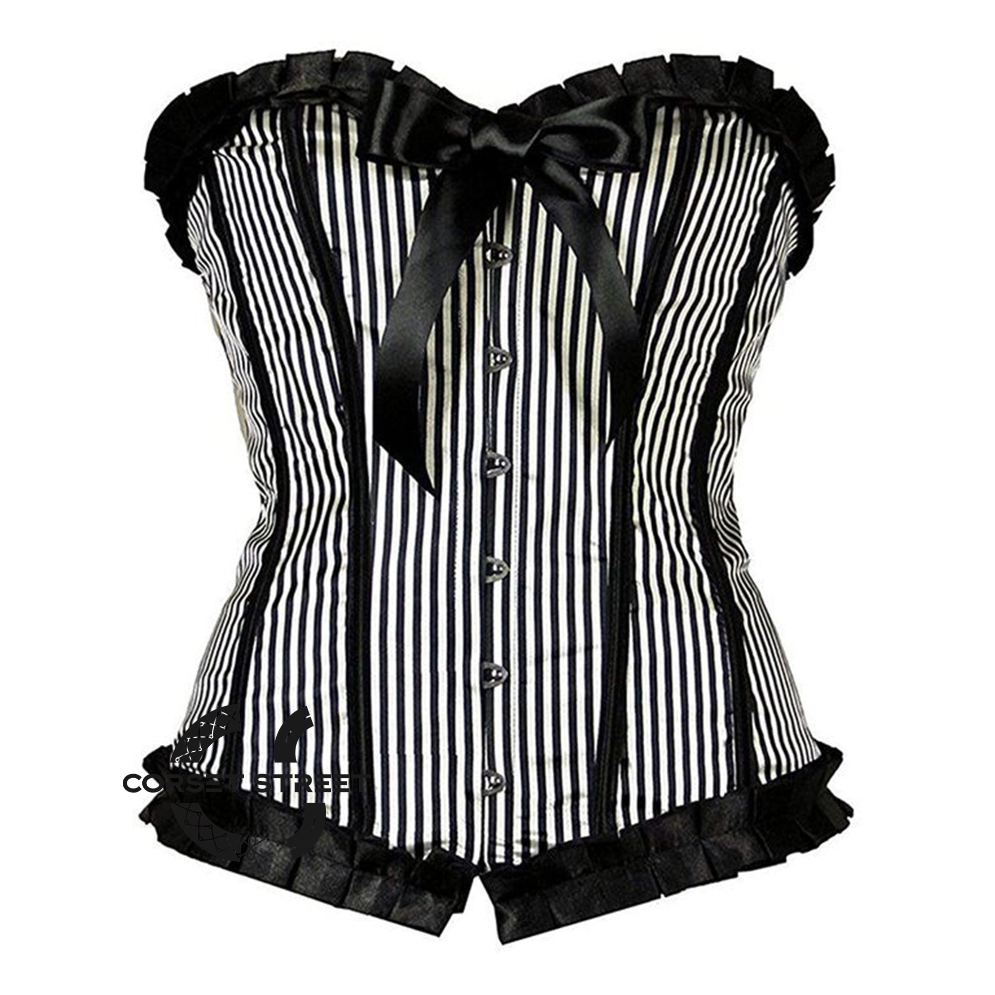 A black and white cotton striped frill gothic overbust corset is a garment that combines a bold gothic aesthetic with a playful frill design. The overbust corset covers the torso from the bust to the hips and is designed to enhance the natural curves of the body. The black and white striped cotton fabric gives the corset a classic and edgy look, while the frill details add a touch of femininity and fun.