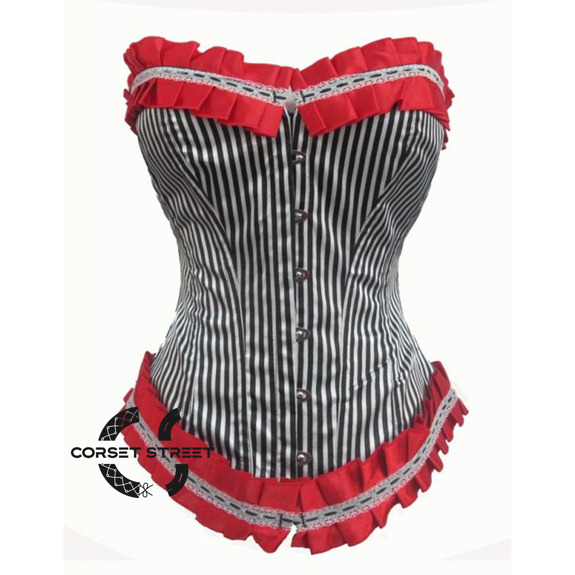 This black and white cotton striped with red frill gothic overbust corset is a stunning and unique piece that is sure to turn heads. Made from high-quality cotton fabric, this corset features a bold black and white stripe pattern that is both edgy and elegant.