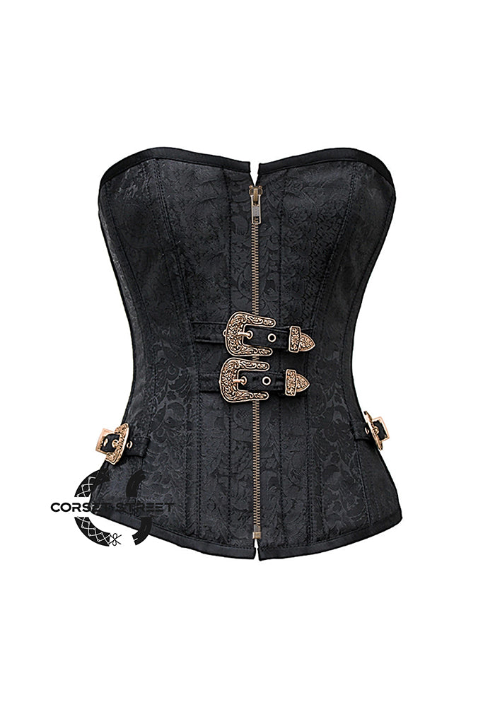 Black Brocade Antique Zipper Gothic Costume Waist Training Bustier Overbust Corset Top