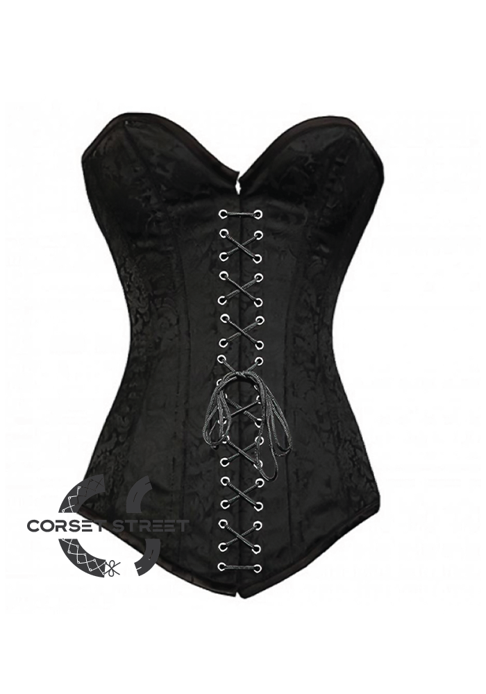The black brocade over bust fashion corset has extremely pretty criss cross lace detailing at the front with black lace which gives it a monotonous look and makes it look more put together and elegant. It is completely steel boned and has tie up laces at the back as well.