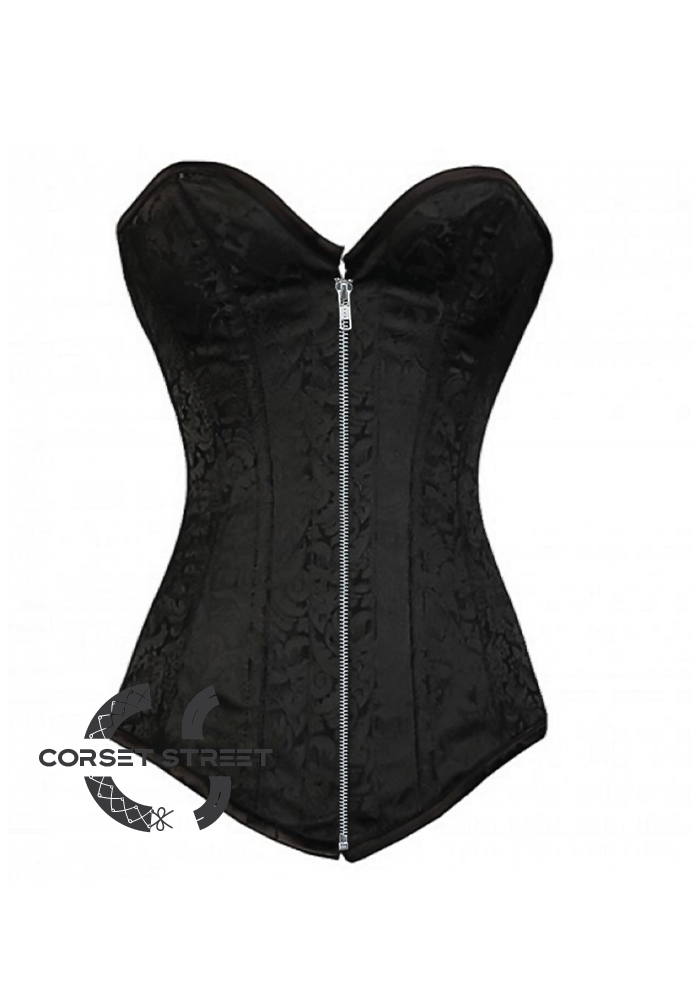 The gorgeous black brocade over bust fashion corset with silver zip at the front also comes with tie up lace detailing at the back to give the corset extra comfort and a neat look. It is completely steel boned which hugs your torso and give it a really nice shape.