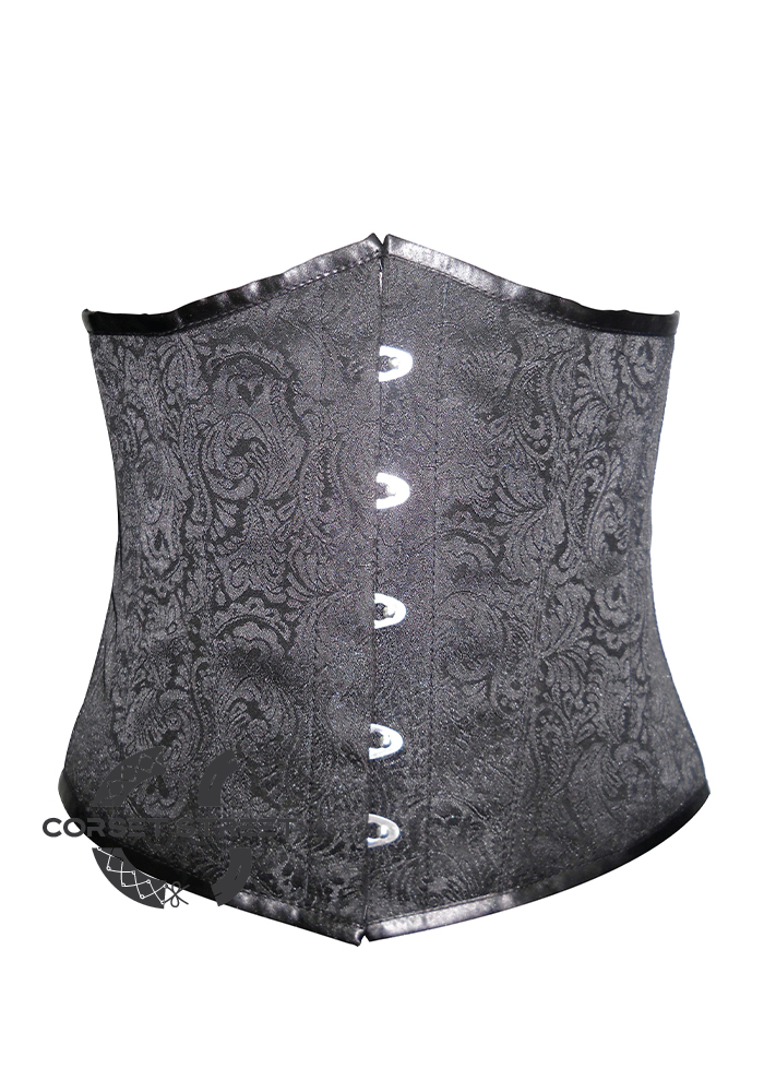 Underbust brocade corset in black benefits from the dual design of brocade texture and black satin tape.