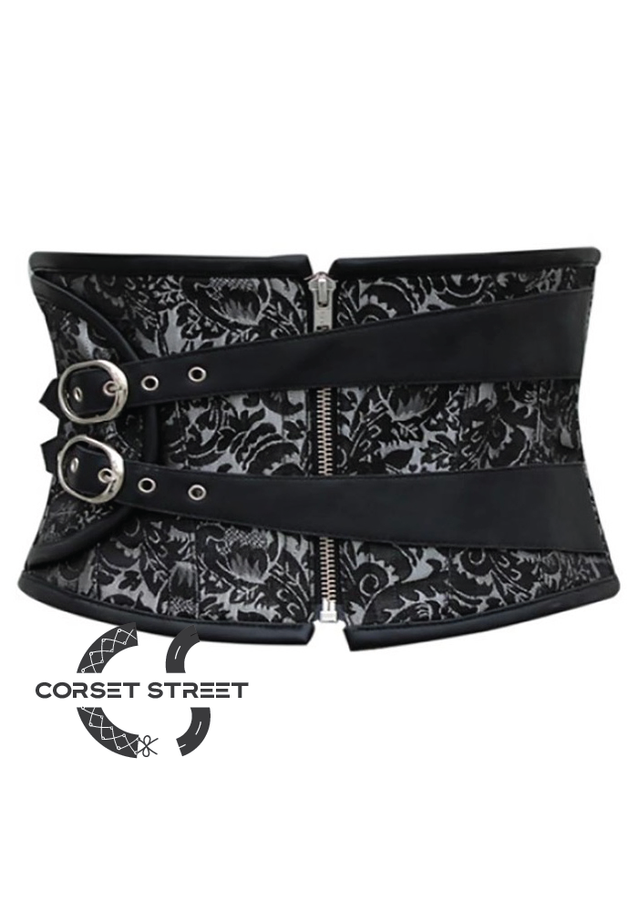 2 asymmetric black belts cross over this black and silver underbust corset to provide a unique look.