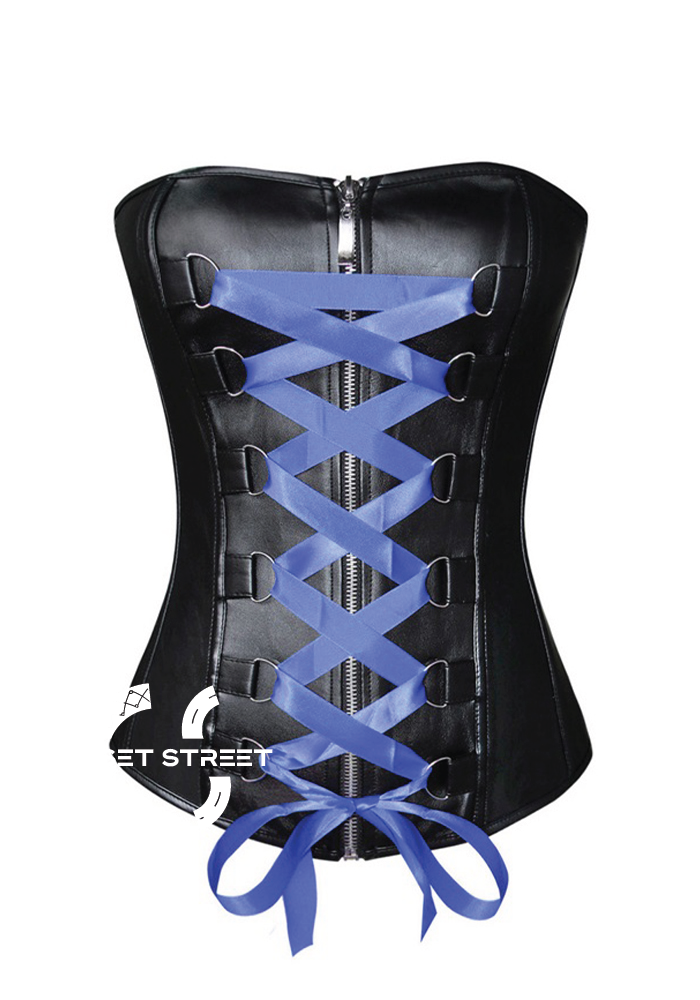 A simple blue satin lace crisscrosses this black leather overbust corset above front zipper opening. The corset turned into an enticing costume and provide you a complete pin-up look.