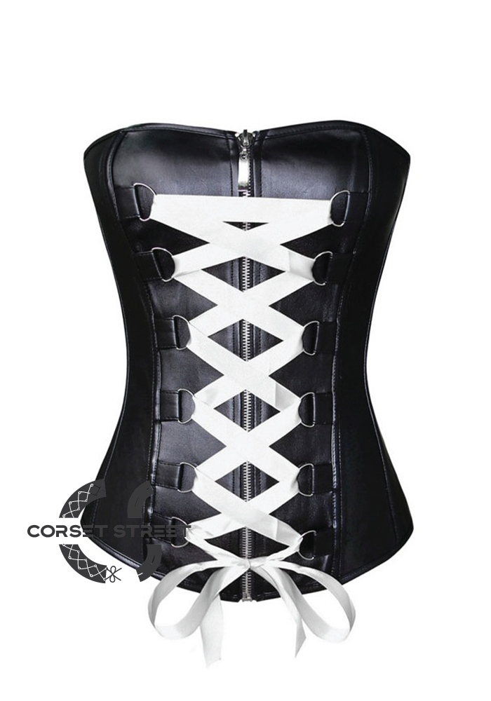 A simple white satin lace crisscrosses this black leather overbust corset above front zipper opening. And the black and white corset turned into an enticing costume and provide you a complete pin-up look.