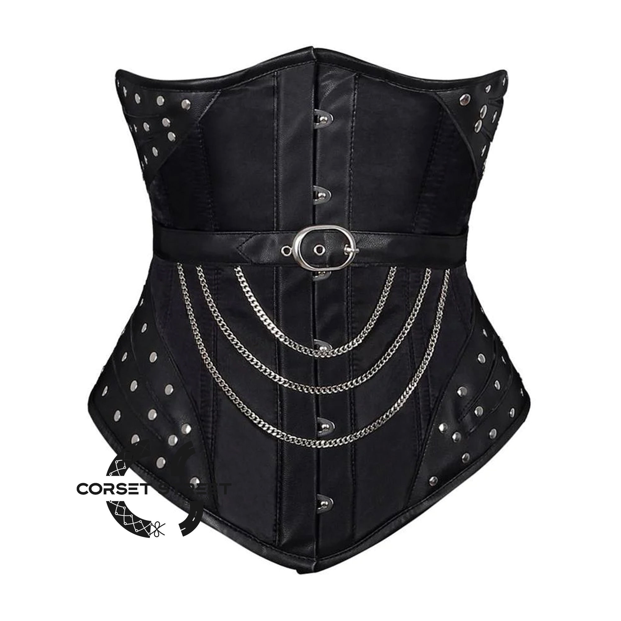 A black corset with a longline underbust is a bold and funky garment. The corset is adorned with a variety of detailing, including buckles, chains, and other decorative elements, adding a touch of glamour and ruggedness to the design. Whether worn as a fashionable outfit or used as a decorative element, this black leather corset with a lot of detailing, buckles, chains, is sure to blow you away into a style frenzy . Throw in a pair of slacks and boots and you are ready to party!