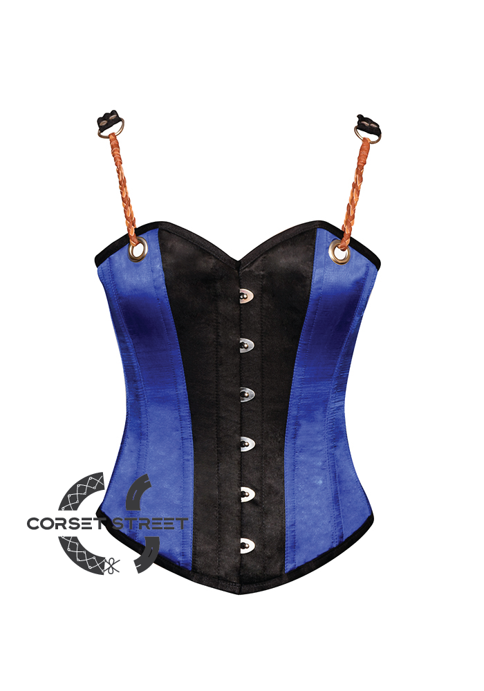 This glamorous full body corset in blue and black satin stripes with leather straps. This corset is designed for confidence and attention and is sleek and sexy.