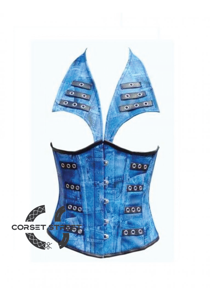 Blue Denim Print Leather with Collar Style Waist Training Underbust Corset Top
