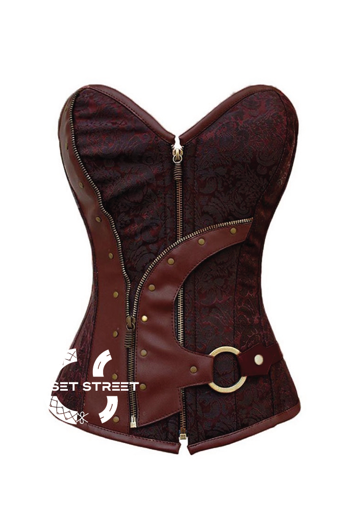 There’s an air of comfort along with sexy steampunk period look in this brown overbust corset. It comes with a front zipper and leather work across the corset and is complemented by zipper on leather and a buckle attached with a patch.