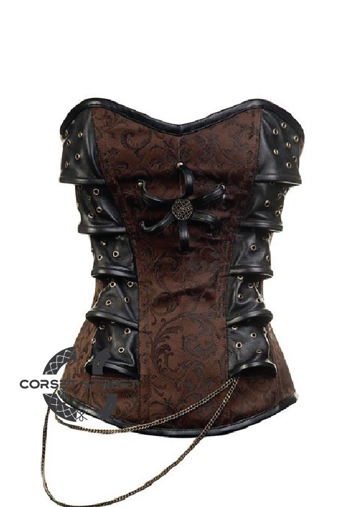 A brown brocade strapless with faux-leather patches and beautiful central design corset will go well with sexy mini skirt. The ideal club wear outfit that looks great on all body shapes and the chain provides an accessory.