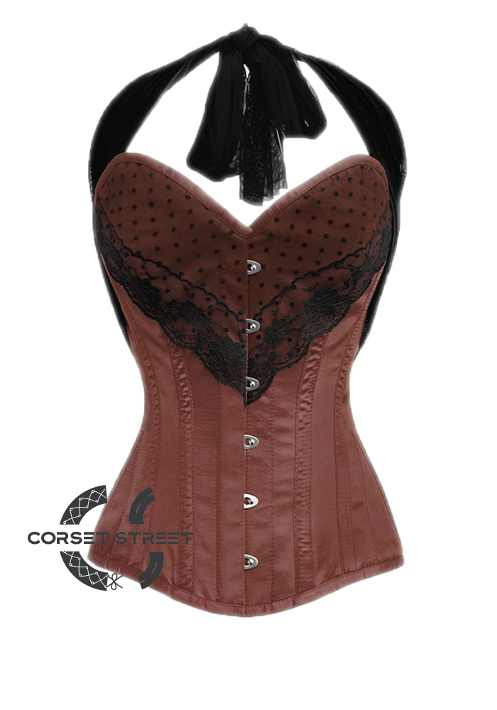 Black Net Strap runs over your shoulder tied around your neck in this stunning brown satin fabric corset. Imagine this teamed with a flouncy tutu skirt for immediate cuteness or over a plain dress for earthy look