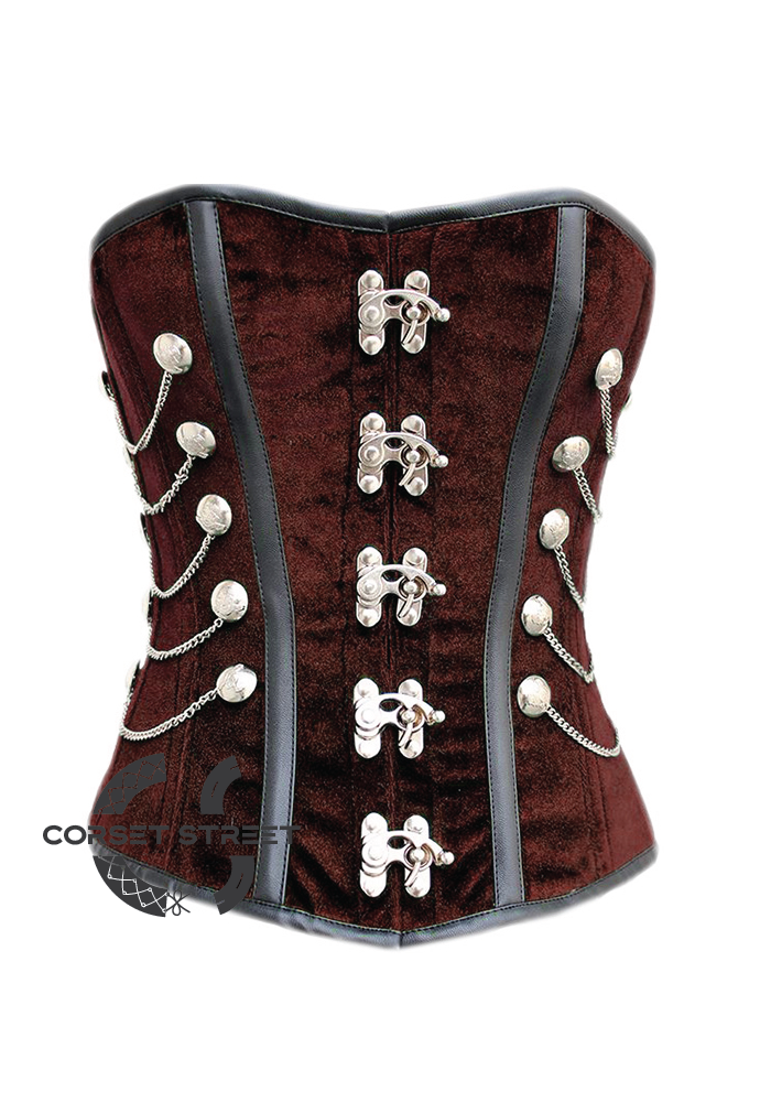A soft fabric like velvet is graced with metal chains and seal locks, gives the corset a complete steampunk looks. Brown color velvet with black leather strips, only adds to the gothic costume.