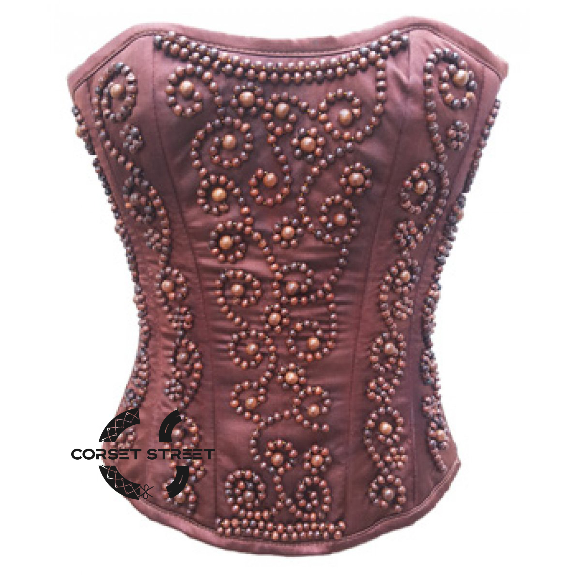 The swirly wooden sequins design on this gorgeous burgundy satin renaissance corset is simply exquisite. Richly adorned, with a vintage corset feel, its retro appearance is very now. Your magical, dreamy fairy tale awaits you.