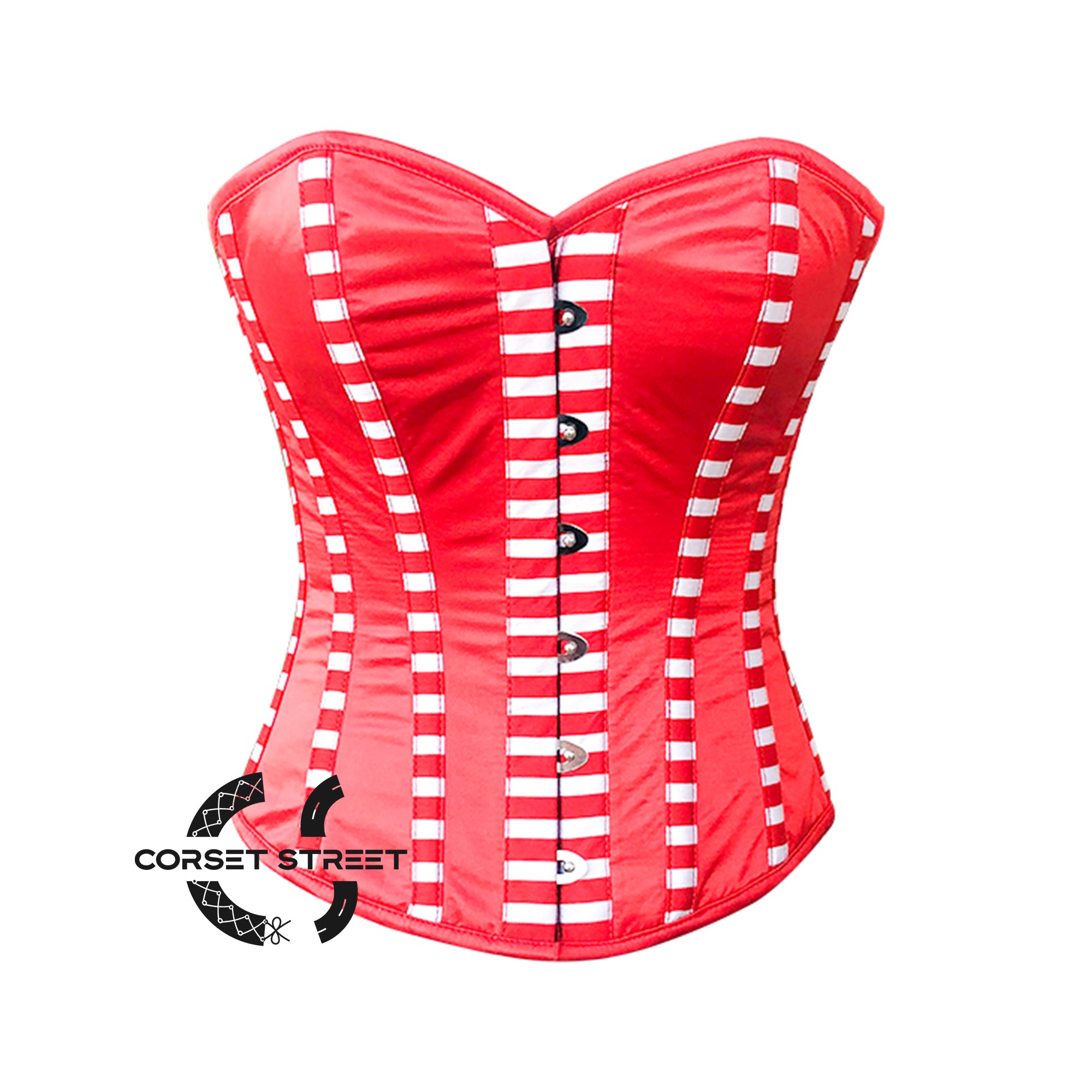 Red Satin Corset adorned with stripes on piping and front panel, makes it a perfect Christmas Costume