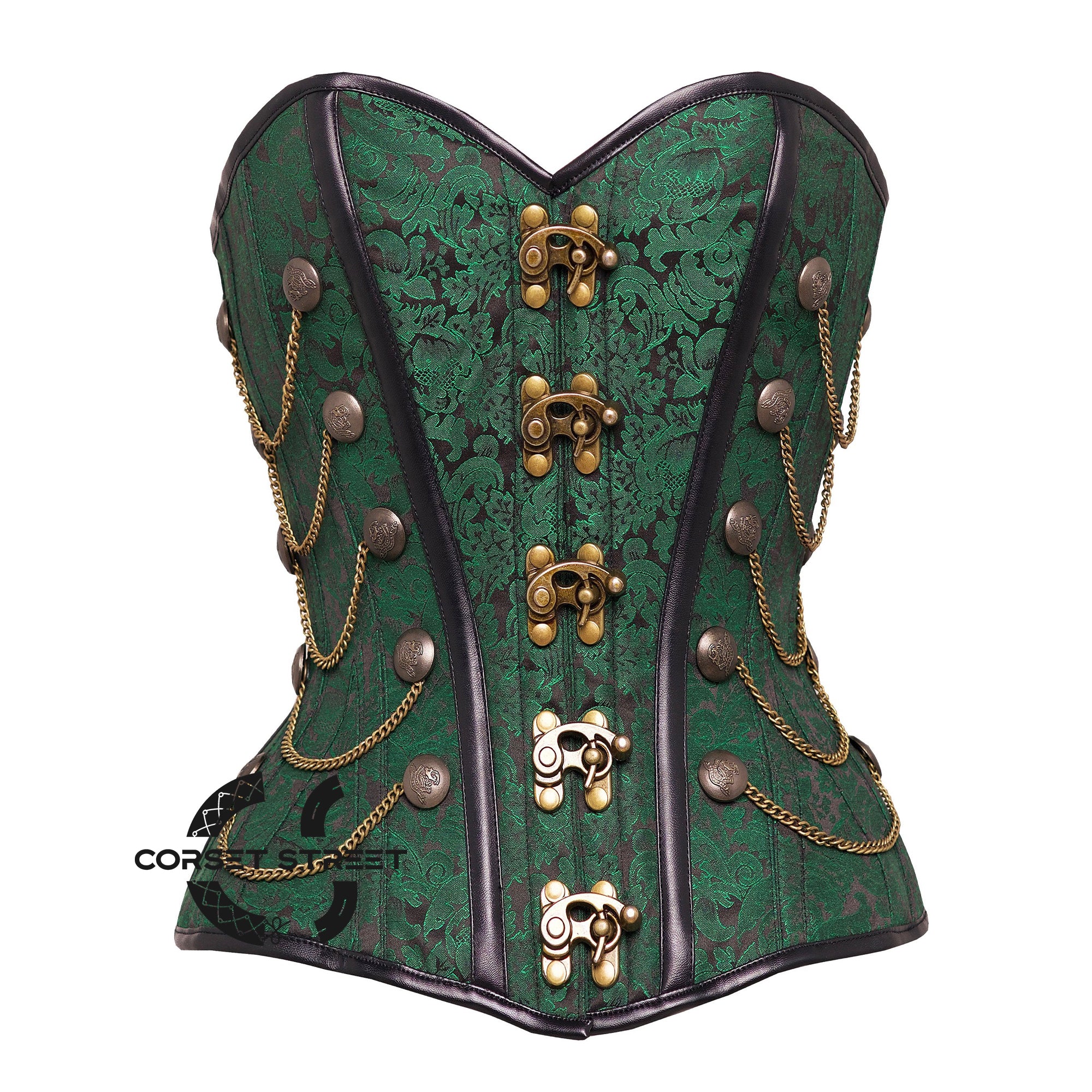 Unleash your inner gothic goddess with our Green and Black Brocade Steampunk Antique Clasps Waist Training Corset Overbust Top. Made with luxurious brocade fabric and featuring antique clasps, this top is perfect for steampunk and gothic-inspired costumes or everyday wear. Designed for comfortable waist training, it provides both style and function. Shop now and add some edge to your wardrobe!