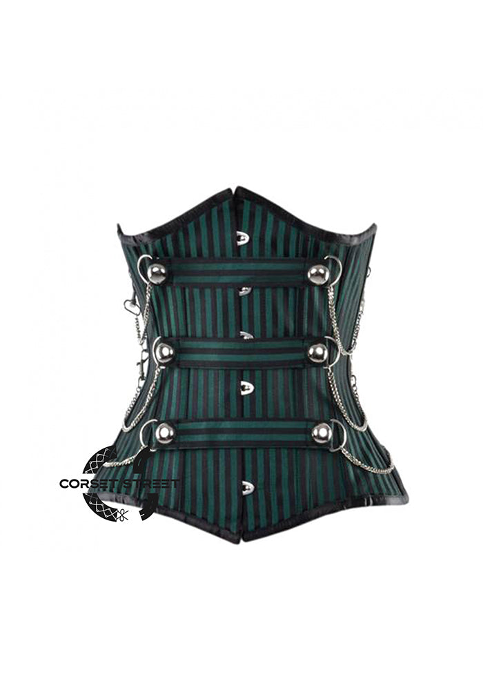 Green and black striped front hooked underbust corset. This corset will you the queen of the hood with a little formal touch and the with chains on the sides its a fusion of grunge and decorous.It can be styled with a white shirt and black pants.