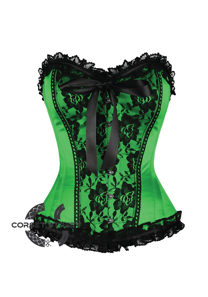Beautiful green satin with lacing work overbust corset will make you look gorgeous. The green, satiny material feels as good as it looks and black Net at the central panel adds elegance to it.