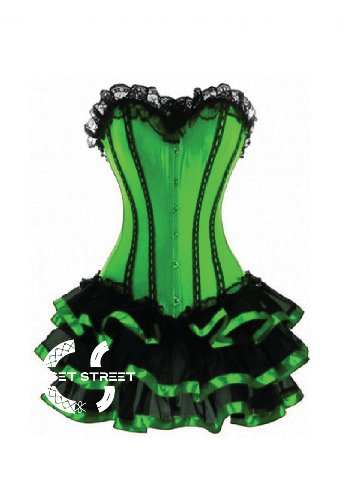 Within every girl lies a Burlesque Queen. Be the star of the show with this sexy green satin corset dress made to turn heads. Sleek lines, pretty black trim at the bust and gorgeous black satin with matching color lacing at the border skirt for the ultimate wow factor.