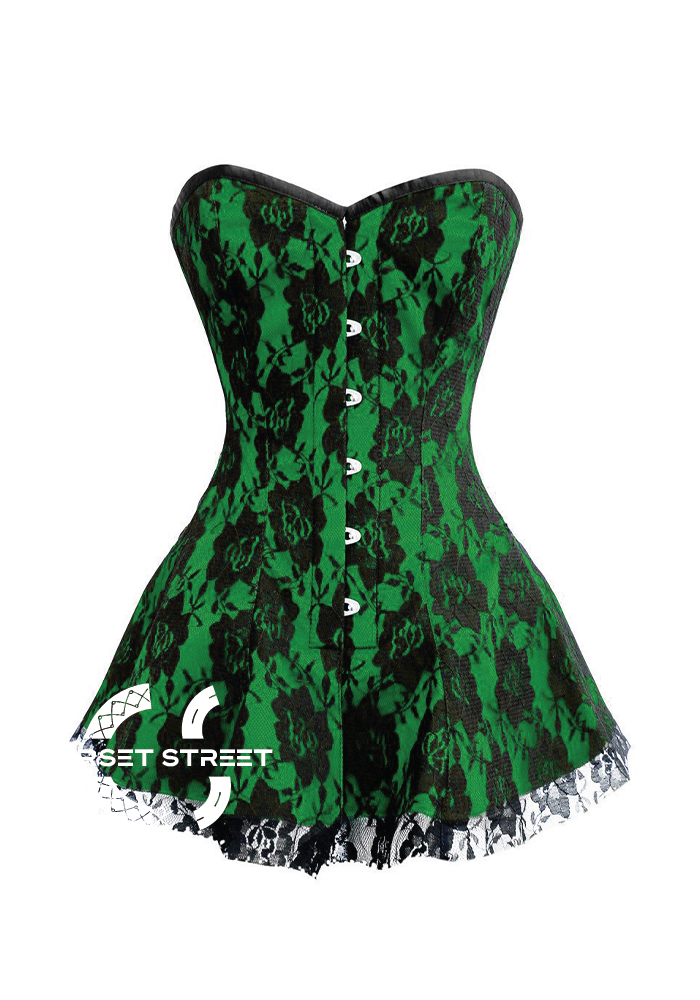 Within every girl lies a Burlesque Queen. Be the star of the event in this magnificent Green Satin Overbust corset dress with black net overlay which gives you a very confident and impressive look.