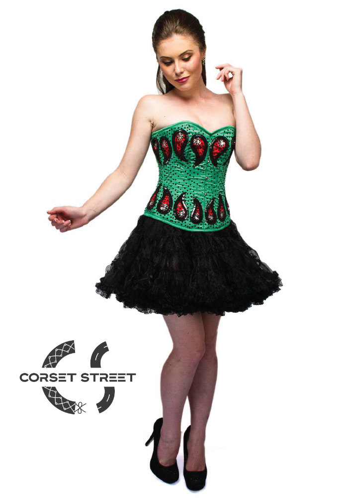 Beautiful green Plus Size corset with red sequined hand work on satin fabric will well go with your short skirt. This corset is the embodiment of style and elegance.