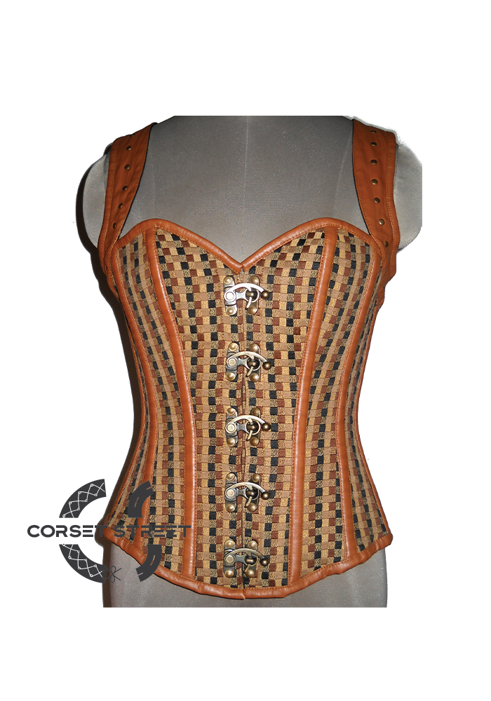Cotton Jute with Faux Leather Piping, Strips & Shoulder Straps Steampunk Overbust Corset