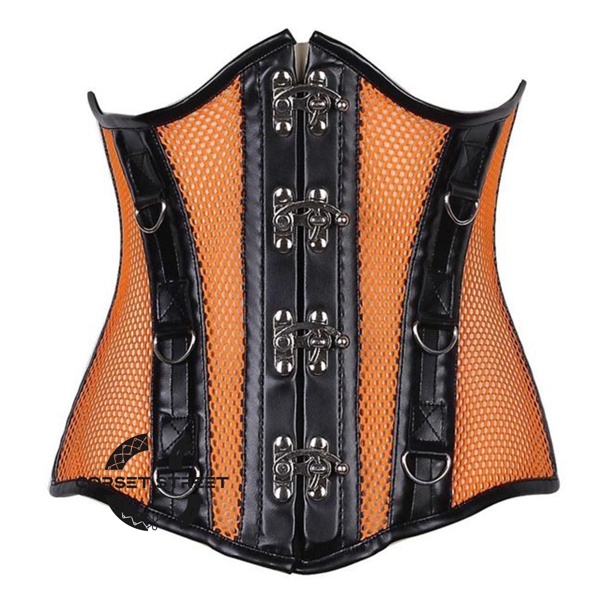 Based on your description, the corset appears to be primarily made of black faux leather and features an orange mesh fabric as a decorative element. The term "underbust" suggests that the corset does not cover the breasts, but rather stops just below them, leaving them exposed. This type of corset is often worn as an accessory to complete a steampunk-themed outfit or as part of a costume.Corsets have a long history in fashion and were popularized in the 16th century as a way to shape the body and achieve an hourglass figure.