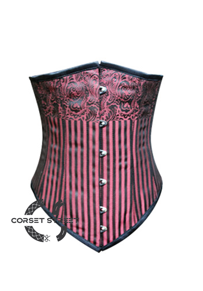 The brocade swirls on this long underbust Plus Size corset give way deliciously to pretty candy stripes in pink and black which all help give the illusion of height and streamlined curves.