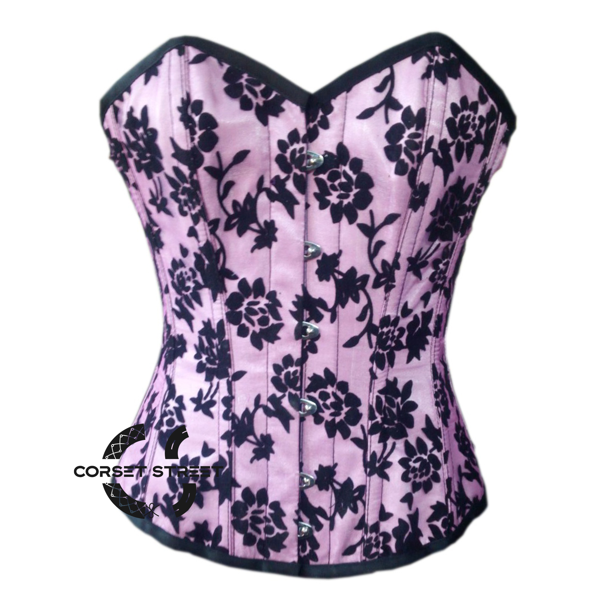 Quirky, black floral tissue flocking placed on a pink satin overbust corset dress. Stylish, individual and is available up to waist size 45″. Plus size or not, you will radiate confidence.