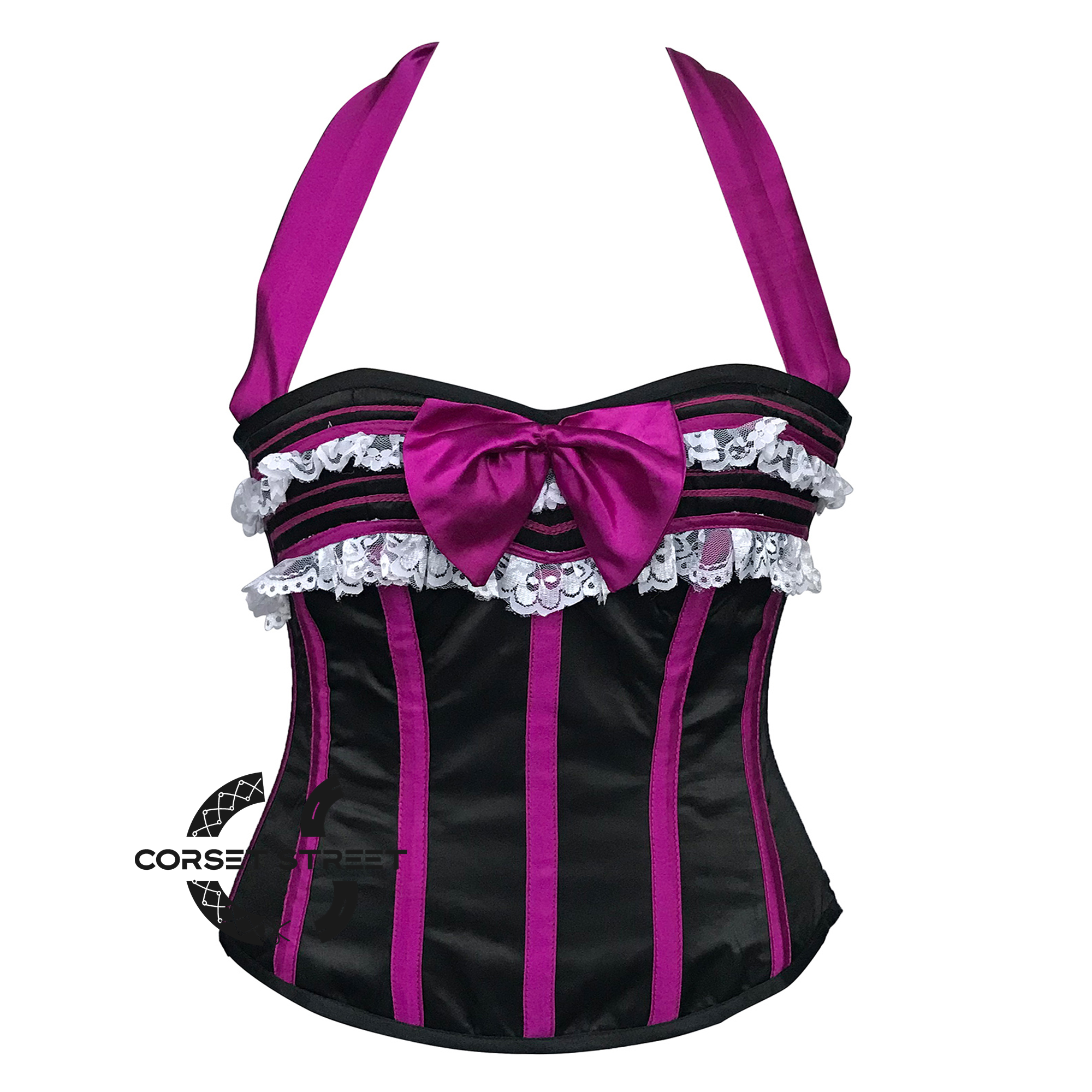 Purple And Black Satin With Front Bow Halter Neck Burlesque Gothic Overbust Corset Top