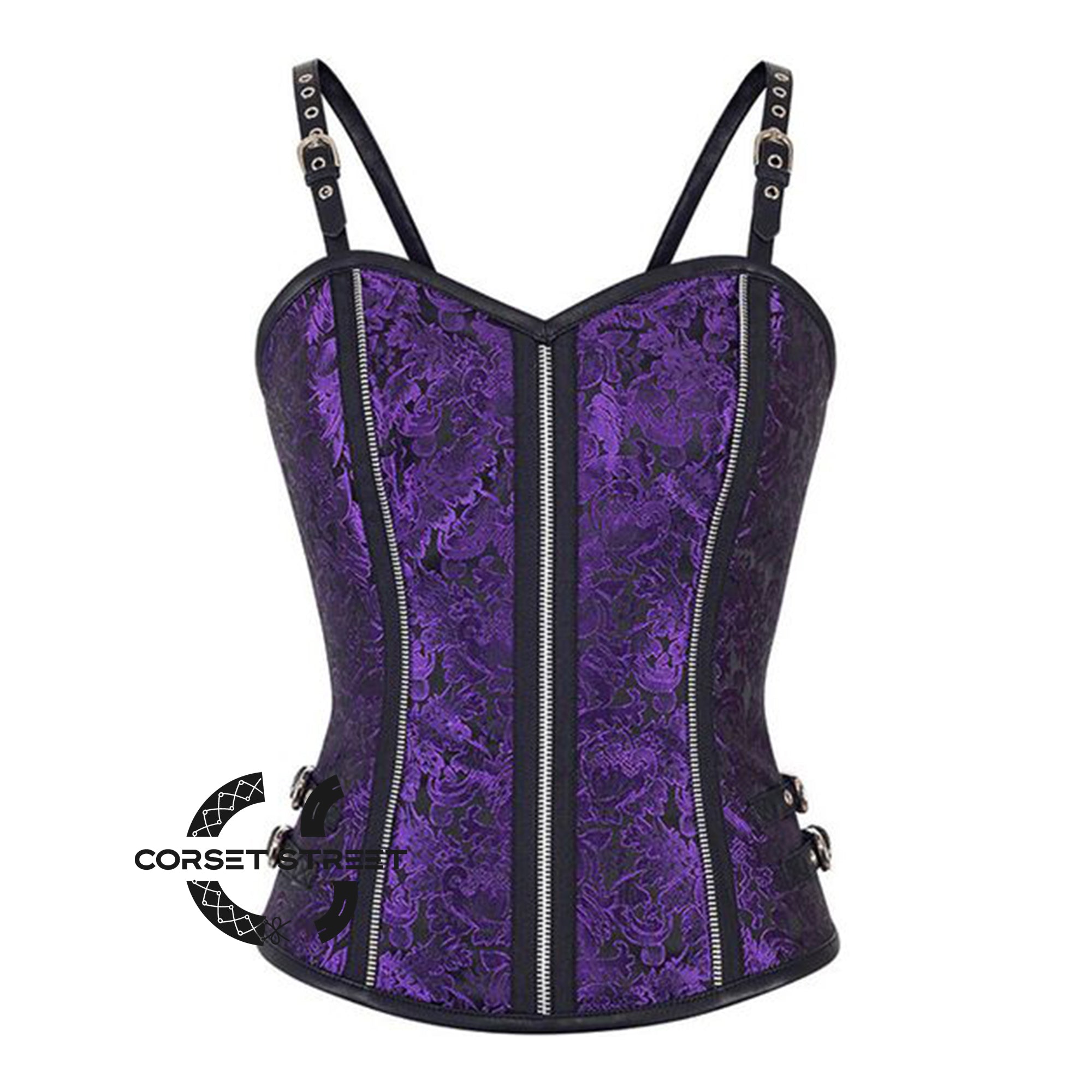 The purple and black brocade with leather strap overbust corset is a stunning and unique piece that combines luxurious fabric with edgy leather detailing. Made from high-quality brocade fabric, this corset features a rich purple and black color scheme with intricate detailing.The overbust design provides ample support and coverage, while the steel boning ensures a comfortable and secure fit. The corset also features leather straps on the sides and at the neckline, adding a touch of industrial edge to the otherwise elegant design.