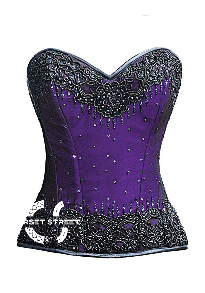 • Purple Satin Black Handmade Sequins Work Overbust Corset Top