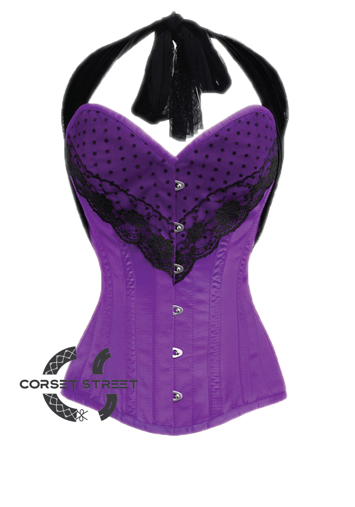 Purple Satin Black Net Halter Neck Gothic Burlesque Bustier Waist Training LONG Overbust Plus Size Corset Costume