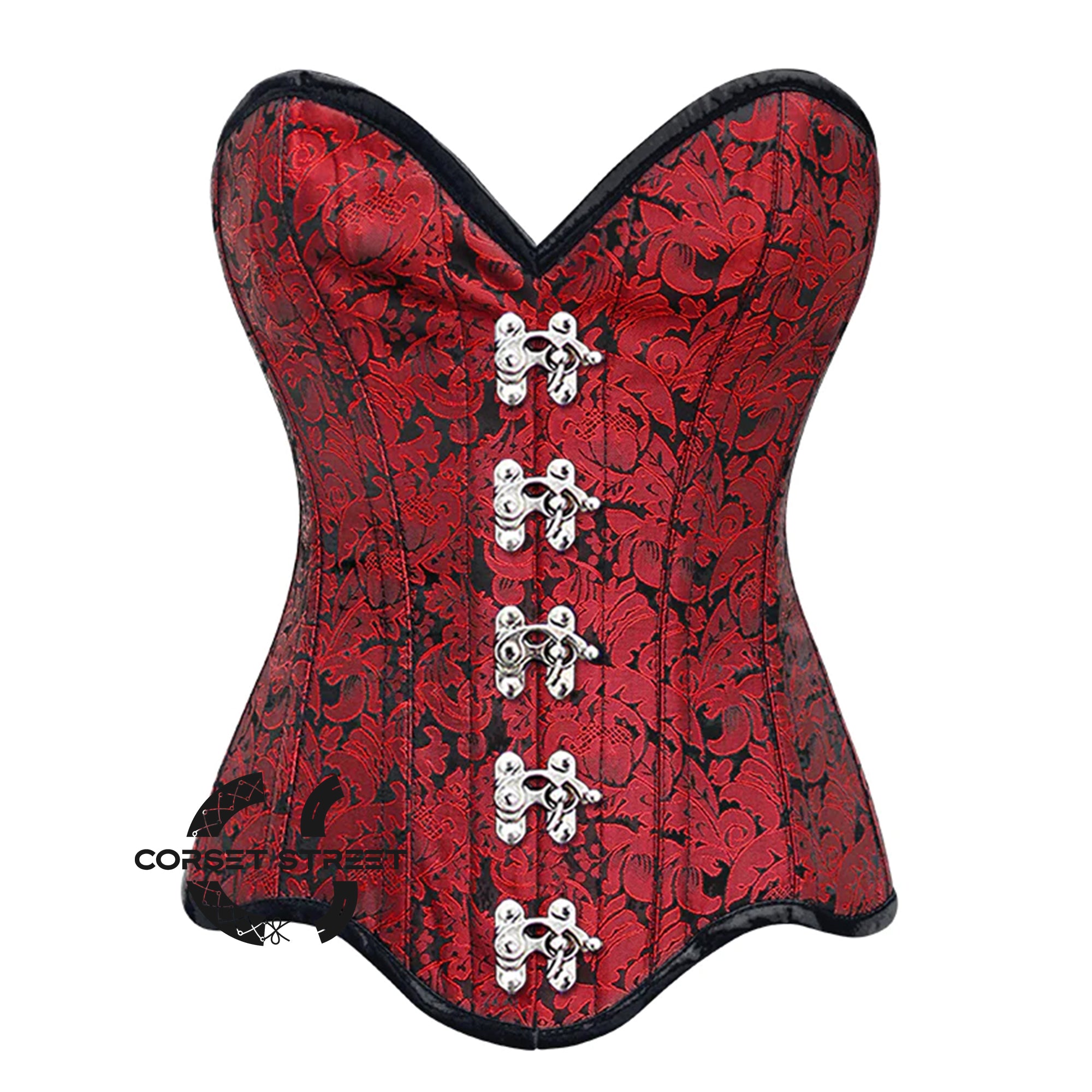 Elevate your steampunk and gothic fashion with our captivating Red Brocade Bottom with Curvy Design Front Clasps Corset. Meticulously crafted, this overbust corset accentuates your curves and adds an alluring touch to your style. The vibrant red brocade fabric, adorned with a curvy design, exudes elegance and mystery.