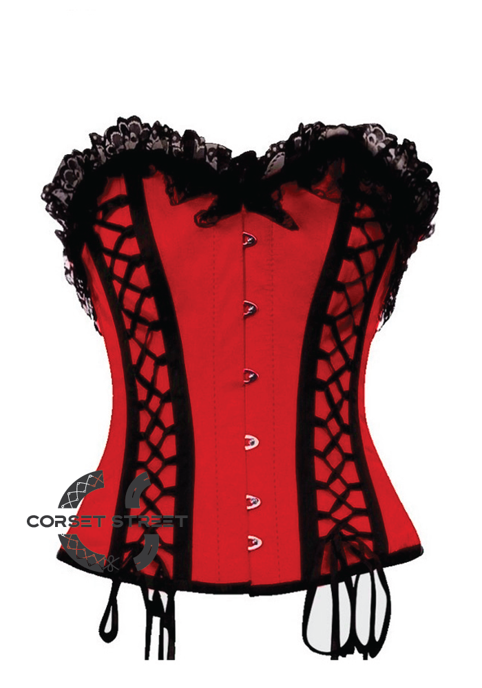 Beautiful red satin overbust corset with black lace work over two sides and frills over the bust line will make you look gorgeous.