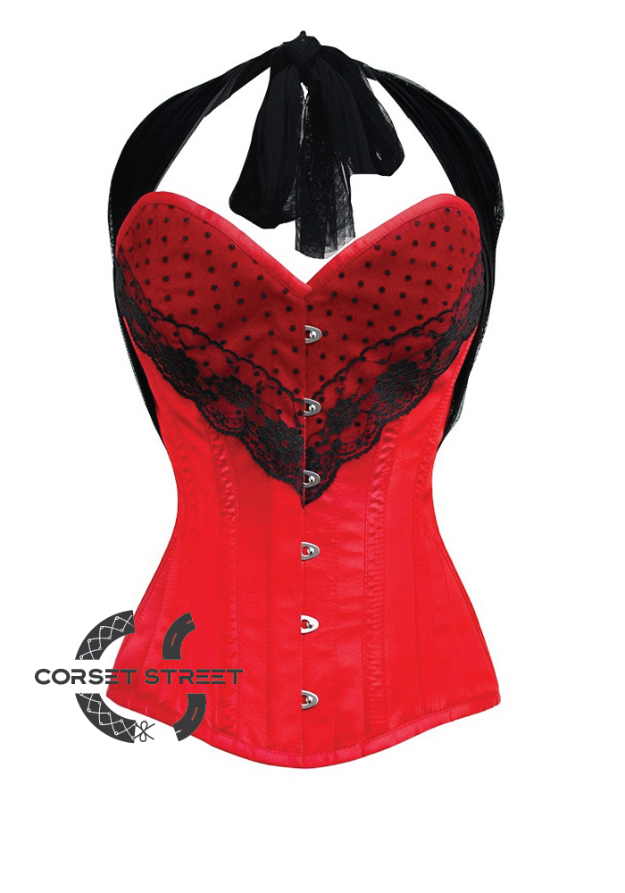 Black Net Strap runs over your shoulder tied around your neck in this stunning red tapta fabric corset. Imagine this teamed with a flouncy tutu skirt for immediate cuteness or over a plain dress for elegance.