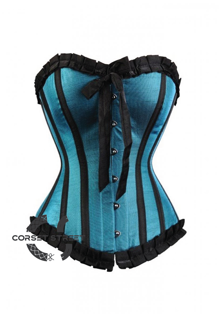 The black piping ruffles and central bow over turquoise satin on this beautiful corset has a gorgeous retro burlesque appeal. Suitable for costume wear, showgirl or a glam event. Available in waist of 22″ all the way up to 52″