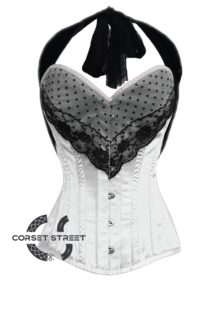 Black Net Strap runs over your shoulder tied around your neck in this stunning in this bright white color satin fabric corset. Imagine this teamed with a flouncy tutu skirt for immediate cuteness or over a plain dress for earthy look.