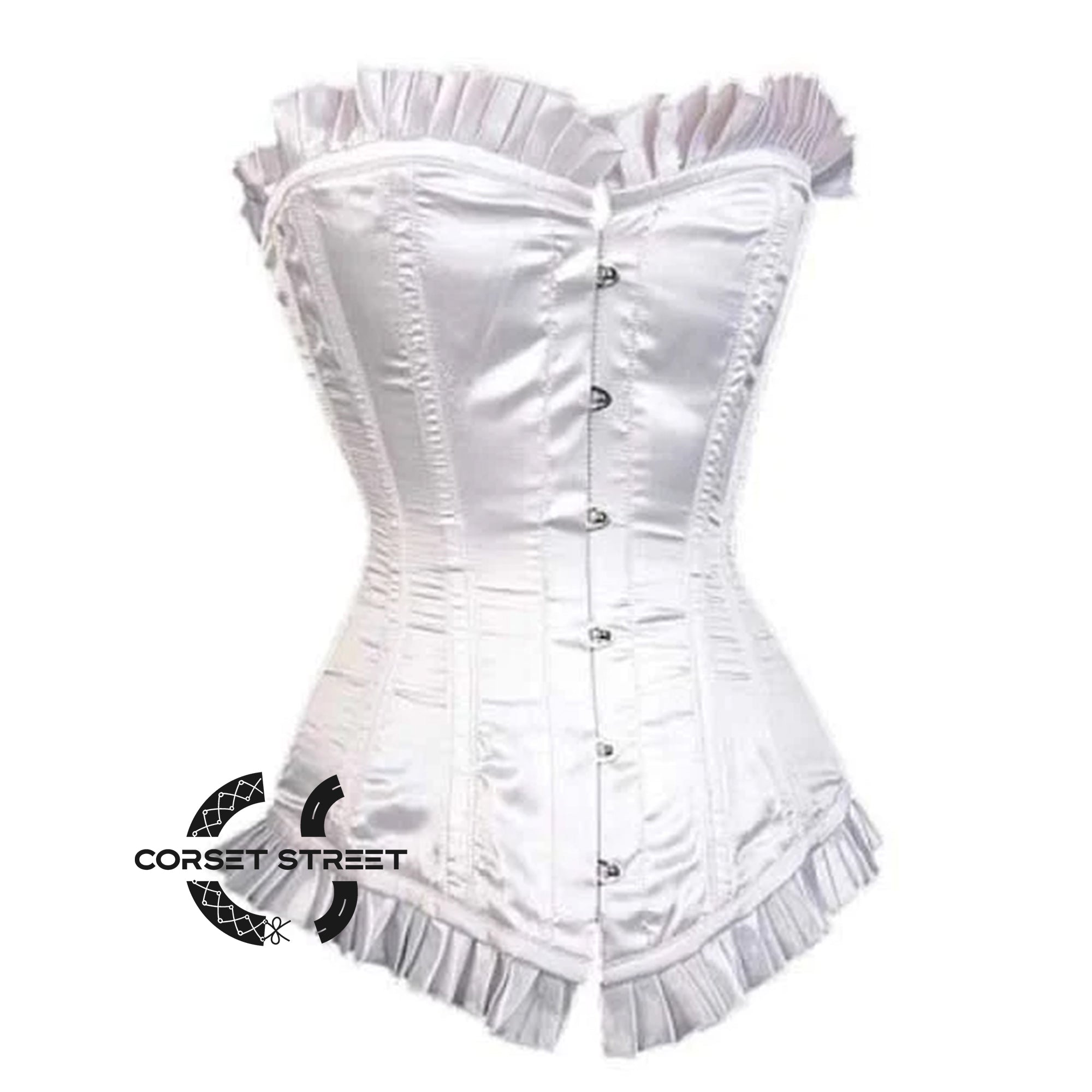 The white satin with frill design gothic overbust corset is a stunning and elegant piece that combines classic beauty with a touch of gothic flair. Made from high-quality satin fabric, this corset features a crisp white color that is both sophisticated and eye-catching.