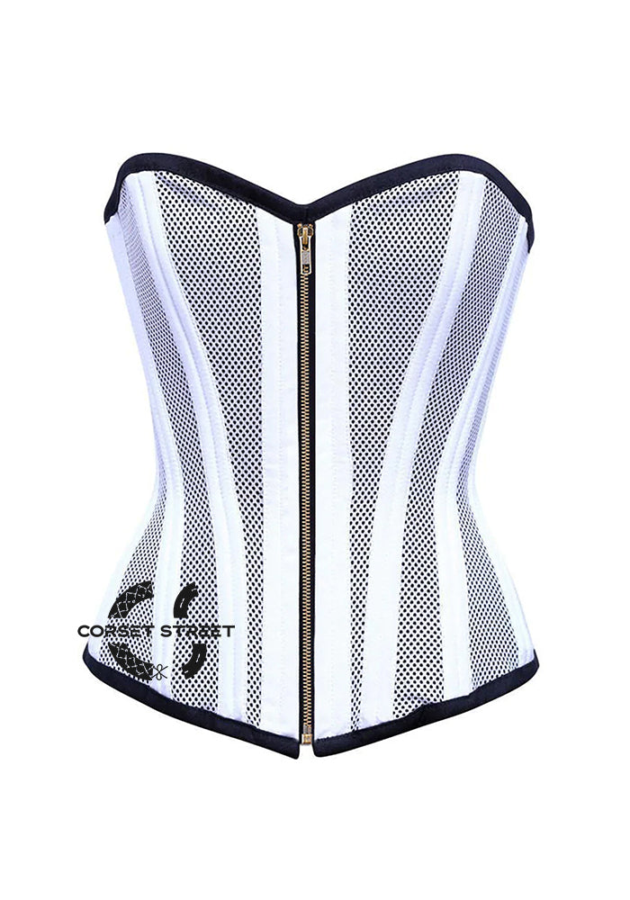 White Satin With Mesh Front Zip Double Bone Burlesque Gothic Overbust Corset Bustier Top