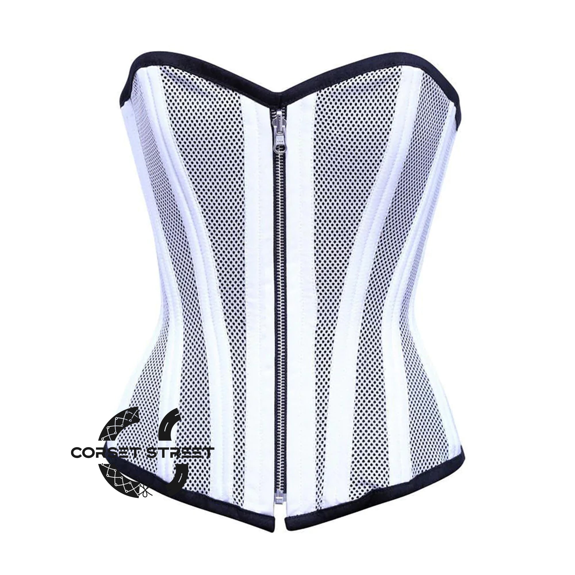 White Satin With Mesh Front Zipper Burlesque Gothic Overbust Corset Bustier Top