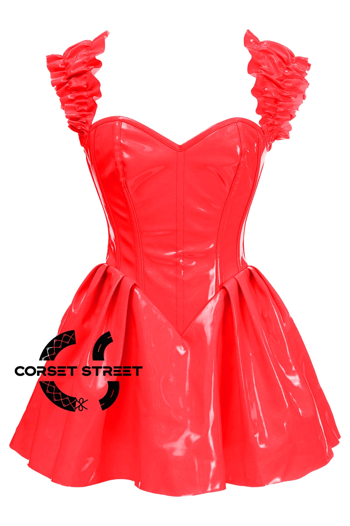Women’s Red PVC Leather Shoulder Strap Overbust Corset Gothic Costume